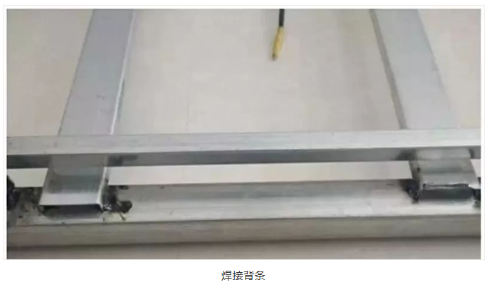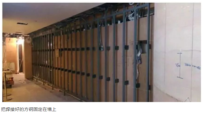 小连框做好后开始焊背条,前两块用板量着焊,找到尺寸后一直往下焊就行了。背条是40mm宽的,长度为1980mm左右,两头能够着好焊就行。焊好后的边框(照的是背面)边框就可以拿到大厅内安装了。墙顶部做好两个角钢挂钩。