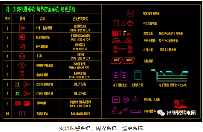 安防报警、周界防范、巡更系统弱电设计图标主要有红外探测器,紧急报警按钮,燃气探测器,门磁,红外对射,无线巡更点等等。