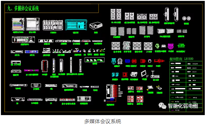 多媒体会议系统弱电设计图标主要调音台,灯光调光台,投影机,功率放大器,专业音频播放器,会议主机,无线手持话筒等组成。