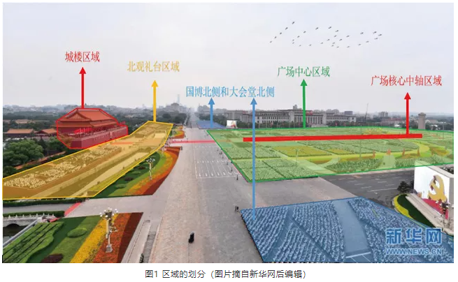 广场区域主要包括北临长安街中线位于献词团两侧的观众席,南至纪念碑,西至广场西侧路,东至广场东侧路。这个区域也是观众数量最多、最集中的地区。