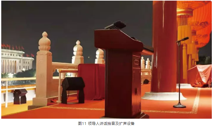 天安门城楼区域的扩声系统主要包括:演讲台周边返送扬声器系统、城楼大殿前区扩声扬声器系统、东西城台扩声扬声器系统、城楼下音效扬声器系统等。