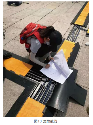 由于广场地区的座椅、设备、线缆大部分都是为本次活动临时搭设的,为了满足流动拾音及扩声、电视转播、新闻报道及其他各指挥部的信号传输及用电需求,现场需要临时敷设大量的强、弱电线缆,如图12、图13所示。而这些线缆与现场观众及演职人员的进出场通道存在交叉,无论是对各部门的系统安全还是现场人员的人身安全都有一定隐患。同时,大会进、撤场时间十分有限,特别是大会结束后,现场所有流动系统设备包括线缆必须在1.5 h内全部撤除完毕,撤除过程中不能与人员、工程车辆、设备设施等产生交叉和冲突。