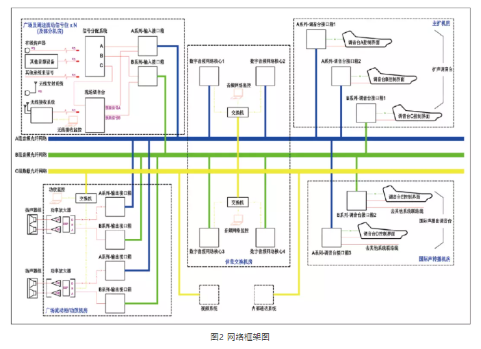 音响系统共设置5个功能子系统,包括:负责音频信号传输和交换的“音频传输网络”;负责控制和其他信号交换的“数据传输和指挥网络”;负责现场声音信号拾取的“现场拾音系统”;负责提供现场扩声服务的“现场扩声系统”;负责国际声信号制作的“国际声制作及多声道录音系统”。