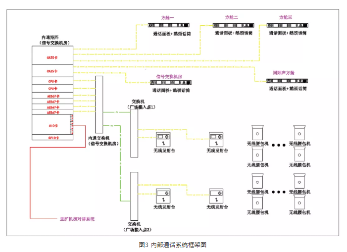 此外,在2019年建成的交换机网络基础上,本项目扩展了综合数据传输网络的功能,如图2中的黄色部分,增加了AoIP内通系统,如图3所示,并增强了视频监控网络。综合数据传输网络与音频网络从物理上进行隔离传输,进一步保证系统的安全性,提升系统的功能性。