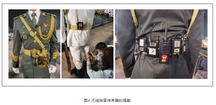 国旗护卫队的口令、抽刀、脚步的拾音使用的是有线+无线的方式。从人民英雄纪念碑到国旗杆之间280 m,有线拾音传声器沿红毯沿线均布,同时,在纪念碑台阶和国旗座附近分别设置了用于拾取抽刀和配枪的效果声传声器。无线拾音传声器佩戴于护卫队的胸口、靴子、腰带上,如图4所示,传输系统采用四分集亚洲麻豆精品在线观看,保证信号的安全可靠。通过现场实时的频率监控,有效屏蔽干扰信号。