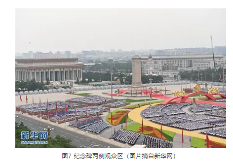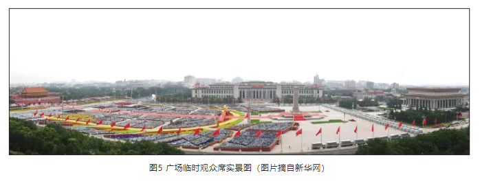 本次大会的观众席大部分为临时搭建,主要包括:天安门城楼上的嘉宾座位和临时看台、长安街北侧固定观礼台坐席、大会堂北侧临时观礼台和国博北侧临时观礼台、天安门广场的临时观礼台等区域。