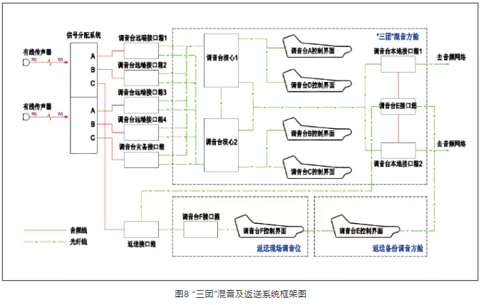 联合军乐团、合唱团、献词团分别由1 314人、2 974人、1 068人组成,大会期间承担前期合唱热场以及青少年致献词的环节。“三团”混音及返送系统设置了近200个通道的传声器拾音,利用传声器分配系统直接送入在“三团”附近的调音台网络,并实现分区域返送,如图8所示。现场和混音方舱内的调音台系统之间通过光纤以双星型网络连接,所有信号从拾音、传输到混音都实现了主备冗余。